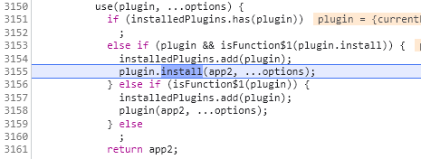 在该方法中参数 plugin 就是第二步中返回的 router 对象,该对象中有 install 方法,直接执行 plugin.install(app2,…options)